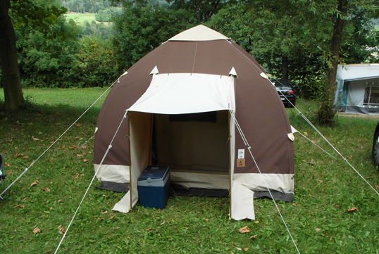 "Daarbij zijn extra ruimte en mogelijkheden te creëren door een voorwand aan de boogluifel te ritsen. Ook deze wand is als luifel uit te zetten (waarvoor stokjes worden bijgeleverd) en links en rechts oprolbaar. Deze mogelijkheden maken, dat de voorhal zowel bij goed als bij minder goed weer uitstekend te gebruiken is."